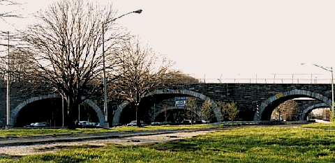 This 1998 photo shows the triple-arch overpass crossing the Grand Central Parkway at EXIT 11 (Jewel Avenue-69th Road) in Forest Hills. (Photo by Jeff Saltzman.)